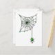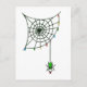 Una araña adornada con un color verde adorable y espeluznante cuelga de su telaraña de esquina sosteniendo un adorno. La telaraña está cubierta de luces Navidades brillantes. Gran giro en una imagen tradicional de vacaciones, de Briana Blair.