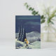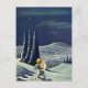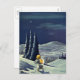 Imagen de festividad de Navidades religiosos de ilustracion vintage que muestra a un ángel sosteniendo una brillante estrella y caminando por la noche a través de la nieve. Este paisaje nevado incluye algunas colinas onduladas, árboles y un pueblo a la luz de la luna. Un diseño de religión cristiana con un cherub angélico llegando a la ciudad.