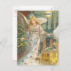 Ilustracion de época Navidades victorianos religiosos imagen de festividad con un ángel con alas y un peine con estrellas de oro flotando y sosteniendo un árbol de Navidad. Una mujer angélica con una iglesia, carruaje y luna llena en el fondo. El texto dice "Feliz Navidad".