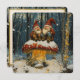 Dos alegres gnomos, vestidos de rojo y blanco, se sientan acogedoramente en una gran seta con la punta nevada. La seta está adornada con luces centelleantes, creando una atmósfera mágica. El bosque circundante está cubierto de nieve, con árboles desnudos y una capa de polvo fresco. La escena evoca una sensación de calidez y alegría navideña.