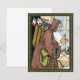 Ilustración vintage estilo victoriano imagen de Santa Claus de la alegre Navidad con San Nicolás vestido con un abrigo marrón que pone una naranja en un zapato de madera. Lleva una bolsa llena de juguetes y una bandera francesa en la espalda. Más zapatos con juguetes, dulces y naranjas están en el alféizar cubierto de nieve. ¡Saludos de la temporada y Felices Fiestas!