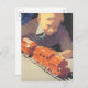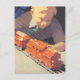 Ilustracion vintage Art Deco Diseño navideño de Feliz con un niño feliz jugando con su nuevo tren de juguetes en la mañana de los Navidades. ¡Saludos de temporada!