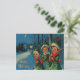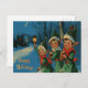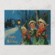 Impresión vintage de Navidad de elfos felices llevando regalos en una noche invernal nevada.