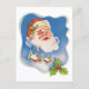 Ilustración vintage de diseño navideño que presenta una cara de Santa Claus flotante sobre un pueblo cubierto de nieve. Una cinta con estrellas y acebo de Navidad enmarca la escena.