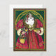 Ilustracion de época estilo victoriano Feliz Navidad alegre diseño de Santa Claus con el viejo San Nicolás vestido con un elegante y elegante abrigo rojo con hojas y bayas huecas alrededor del cuello. St. Nick sostiene a un caballero de juguete montando un caballo en una mano con una canasta de golosinas y un tazón en la otra. Borde verde y rojo decorativo. ¡Felices fiestas y saludos de temporada!