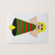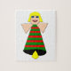 Este asombroso rompecabezas cuenta con un ángel Navidad con el pelo rubio, ojos azules y una gran sonrisa. Su cuerpo es una campanilla festiva de color verde y rojo con una capa amarilla en la parte inferior.
