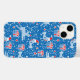 Navidades azules rojos y blancos funda de patrones, con adorables pájaros cantando y ciervos bailando sobre regalos en la nieve de Sarah Trett.