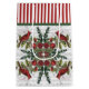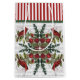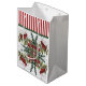 Navidades Cardenal sobre la bolsa de regalo de bifurcación de pino con franja roja y blanca enmarcada por una banda verde.