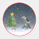 Un lindo cachorro personalizado está cantando a una pequeña estrella iluminada por el árbol de Navidad con un hueso de perro rayado rojo y blanco y una nota musical verde. El fondo es una noche estrellada. Agregue texto o edite para crear su pegatina de sello para sobres o libro de recortes personalizado.