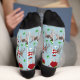 Perros de caza con cortometraje alemanes con hígado y abrigos blancos con cosquillas se sientan y se ponen de pie en trajes festivos. Sombreros de Papá Noel, cántaros, sudaderas en un entorno vacacional con adornos dispersos.