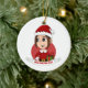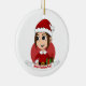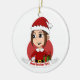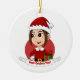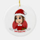 Ornamento navideño con el ilustracion de una linda sonriente y feliz chica con el pelo castaño largo, lleva disfraz rojo y blanco de Santa Claus y tiene un regalo; con plantilla de texto editable para tu nombre o mensaje, Navidades diseño de vacaciones