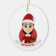Ornamento navideño con el ilustracion de una linda sonriente y feliz chica con el pelo negro corto, lleva disfraz rojo y blanco de Santa Claus y tiene un regalo; con plantilla de texto editable para tu nombre o mensaje, Navidades diseño de vacaciones con fondo rojo