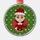 Diseño con un ilustracion de una linda sonriente chica feliz con el pelo negro corto, lleva disfraz rojo y blanco de Santa Claus y tiene un regalo; Navidades diseño de vacaciones con un fondo verde sin fisuras con estrellas