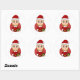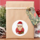 Diseño con un ilustracion de una linda y sonriente chica feliz con el pelo rubio corto, lleva el traje rojo y blanco de Santa Claus y tiene un regalo; diseño de vacaciones para Navidades con fondo blanco