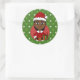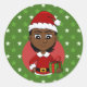 Diseño con un ilustracion de una linda sonriente feliz chica negra de pelo corto, lleva disfraz rojo y blanco de Santa Claus y tiene un regalo; diseño de vacaciones Navidades con un fondo verde sin fisuras con estrellas