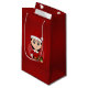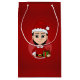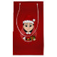 Diseño con un ilustracion de una linda y sonriente chica feliz con el pelo negro corto, lleva disfraz rojo y blanco de Santa Claus y tiene un regalo; Navidades diseño de vacaciones con fondo rojo