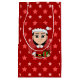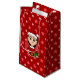 Diseño con un ilustracion de una linda sonriente chica feliz con el pelo negro corto, lleva disfraz rojo y blanco de Santa Claus y tiene un regalo; Navidades diseño de vacaciones con un fondo rojo sin fisuras con estrellas