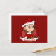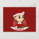 Postal con un ilustracion de un chica feliz adorable y sonriente con el pelo castaño largo, ella lleva disfraz rojo y blanco de Santa Claus y tiene un regalo; con plantilla de texto editable para tu nombre o mensaje, Navidades diseño de vacaciones con fondo rojo