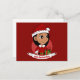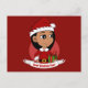 Postal con un ilustracion de un lindo sonriente chica feliz con el pelo largo negro, ella está usando el disfraz rojo y blanco de Santa Claus y sosteniendo un regalo; con plantilla de texto editable para tu nombre o mensaje, Navidades diseño de vacaciones con fondo rojo