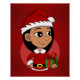 Diseño con el ilustracion de una linda sonriente chica feliz con el pelo castaño largo, lleva disfraz rojo y blanco de Santa Claus y tiene un regalo; vacaciones de Navidades con antecedentes rojos