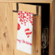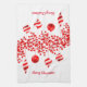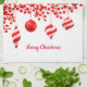 Esta toalla de cocina se muestra en blanco con una bonita tira de adornos rojos y blancos colgando de bayas rojas junto con el texto rojo de Feliz Navidad. Personalizar este artículo o compra como se muestra.