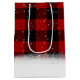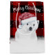 Oso polar con el gorro de Papá Noel Navidad sobre fondo rojo y negro de búfalo y copos de nieve. El texto se puede cambiar o eliminar.