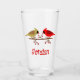 Este impresionante vaso de vidrio Navidad presenta un par de bonitos de Cardenales del Norte. El pájaro macho es rojo brillante con un escudo rojo en la cabeza y el pájaro hembra es de color amarillo parduzco con algo de rojo en las alas y la cola. Ambos pájaros tienen un pico rojo. Los pájaros están sobre una rama marrón cubierta de bayas rojas festivas, lo que hace de este un bonito diseño Navidad, especialmente para las parejas. Hay texto personalizado para que pueda personalizar este diseño con un nombre.