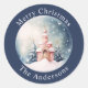 Pegatina con un ilustracion acuarela de una bonita capilla rosa con árboles, nieve y el mensaje 'Feliz Navidad' Todos los textos son totalmente editables, Una perfecta adición a un regalo. También puede usar los pegatinas en el sobre de una tarjeta de Navidades con deseos.