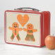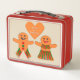 Este impresionante Lunch Box muestra una imagen gráfica de una linda pareja de pan de jengibre. El hombre de pan de jengibre tiene botones verdes y rojos y pantalones con bordes verdes y rojos. La dama del pan de jengibre tiene pestañas de bonito y usa lápiz de labios rojo. Ella tiene una falda roja y verde y encima. Ambos tienen una gran sonrisa. Hay un corazón de pan de jengibre encima de la pareja que muestra su amor por el otro. Hay una escritura blanca dentro del corazón que dice "hecha para el otro". Esto haría un regalo encantador para una pareja en Navidades.