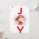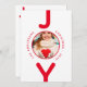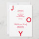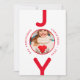 Un Navidad minimalista sencillo y moderno con una carta en blanco y rojo. En el frente: Un fondo blanco moda, con la palabra JOY escrita con letras en negrita rojas. La letra O se usa como marco fotográfico. Personaliza y agrega tu propia foto, nombre y año familiar. Fondo blanco y texto rojo. Añade tus propios saludos y apellidos. Las letras de la palabra JOY como decoración.