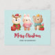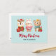 Postal de vacaciones con un lindo ilustracion con un conejito, un oso y un ciervo todos vestidos con ropa de fiesta. Adorable y caprichoso.