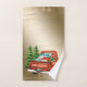 Camión rojo con regalos, pinos y copos de nieve en un fondo brillante.