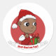 Pegatinas navideñas con el ilustracion de una linda sonriente niña o niño negro feliz, el bebé está usando ropas rojas y blancas y sosteniendo un regalo; con plantilla de texto editable para tu nombre o mensaje, Navidades diseño de vacaciones