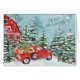La parte delantera de esta tarjeta de felicitación de Holiday es una imagen impresionista de una escena forestal rural invernal, con un granero rojo, pinos cubiertos de nieve y un camión lleno de golosinas Navidades. El camión rojo está estacionado en la nieve, y los copos de nieve se escurren a su alrededor. El texto de arriba dice "Paz en la Tierra". El interior de la tarjeta tiene cuatro campos de texto para personalizar.