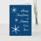 Las elegantes tarjetas navideñas cuentan con Feliz Navidad y Feliz Año Nuevo en un gran guion plateado junto a 3 brillantes copos de nieve geométricos de Relieve metalizado plateado en varios tamaños sobre un fondo azul. Personalizar fácilmente el nombre de la familia y el mensaje dentro.