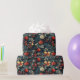 Un diseño rico y colorido presenta adornos, frambuesas y bayas en un fondo oscuro, perfecto para envolver regalos y difundir alegría durante la temporada festiva.