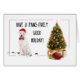 Con una sonrisa y un saludo feliz, este norteamericano blanco Staffordshire Terrier está sentado al lado de un árbol de Navidad. Tarjeta divertida para desear Felices Fiestas y Feliz Año Nuevo.