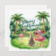 Celebra las vacaciones con un toque juguetón en el golf! Esta acuarela tiene un flamenco rosa vestido de golfista, con un sombrero de Santa, en un frondoso campo de golf decorado para Navidades. Las calles están adornadas con flamencos y las luces de las palmeras crean un ambiente divertido y festivo. El texto escrito a mano "Feliz Navidad" agrega un toque alegre. Perfecto para los amantes del golf, los aficionados de Florida o cualquier persona a la que le gusten los diseños extravagantes de las vacaciones.