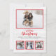 Un diseño de tarjetas de Navidades festivos que incluye cuatro de tus fotos favoritas encerradas con un borde rojo sobre un fondo de madera de una casa de campo blanca. "Feliz Navidad" aparece en el centro en tipografía de escritura roja. La parte posterior de la tarjeta tiene un patrón de copos de nieve rojo y blanco. Personalice esta tarjeta fotográfica única de vacaciones con sus nombres familiares y fotos. Diseñado para ti por Blackberry Boulevard.