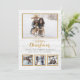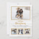 Un diseño de tarjetas de Navidades festivos que incluye cuatro de tus fotos favoritas encerradas con un borde dorado en un fondo de escopeta de madera blanca. "Feliz Navidad" aparece en el centro en la tipografía de escritura dorada. la parte trasera de la tarjeta tiene un patrón de copos de nieve dorado y blanco. Personalice esta tarjeta fotográfica única de vacaciones con sus nombres familiares. Diseñado para ti por Blackberry Boulevard.