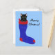 Pintura de un lindo gato negro dentro de un Navidad rojo y azul calado. Se pueden ver sus huellas de la pata inferior empujando contra la media. Este bonito diseño para los amantes del gato está impreso en postales de personalizable.