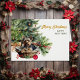 En esta tarjeta de vacaciones, un adorable perro de Yorkshire Terrier se coloca en su cesta de mimbre frente a un árbol de Navidad decorado. Detrás de la cesta también hay un ramo de cerezo y de cono de pino rojo bonito. El texto de la escritura dorada a la derecha dice "FELIZ NAVIDAD", con el FELIZ AÑO NUEVO en verde debajo. Todo el texto, dentro y fuera, puede cambiarse fácilmente a lo que quieras. Puedes ver más imágenes y productos de perros en Dog Village.