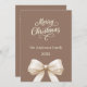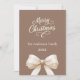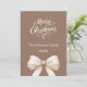 Un mocha, fondo marrón mudo, texto de color crema y arco. Feliz Navidad se escribe con un elegante guión de estilo con letras a mano. Personaliza y agrega tu apellido. Atrás: agrega tu mensaje y tus nombres.