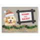 En la parte delantera de esta bonita tarjeta de Navidades, un adorable cachorro Golden Retriever lleva un patrón de sombrero de Santa y compañeros sobre una valla de madera decorada con guirnaldas. Junto a él hay un cartel rústico de madera que dice "MERCÍN y LUZ" en rojo. El interior de la tarjeta tiene dos campos de texto para personalizar.