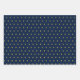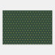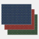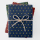 Conjunto de papel envuelto en un patrón clásico de estrellas doradas amarillas sobre un fondo verde, azul marino y rojo.