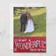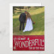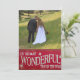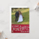 Un cartel rojo y blanco de estilo antiguo con decoración de copos de nieve declara que es el momento más maravilloso del año en esta tarjeta de foto de Navidad. Tu propia fotografía ocupa el centro del escenario en la parte superior. La parte posterior de la tarjeta tiene tres campos para el texto de su personalizado y el mensaje personal.