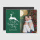 Un elegante ciervo blanco salta por encima de las palabras de los Navidades Esta es la temporada para ser alegre en esta hermosa tarjeta imán de vacaciones. Clásica elegancia con un reno de bonito sobre una magnífica caligrafía y una foto familiar llenando la parte delantera de estas tarjetas magnéticas verdes festivas.