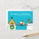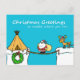 Una postal de Navidades dulces con fondo azul y nieve. Viene con un lindo personalizado de Santa y renos intentando entregar regalos a una carpa cruzando un puente de madera. El mensaje dice "Saludos de Navidad sin importar dónde estés". La tarjeta postal es adecuada para sus seres queridos o amigos que actualmente se quedan lejos y desea hacerles saber que piensa en ellos en los Navidades sin importar la distancia.