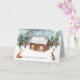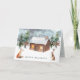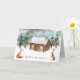 Este diseño representa un ilustracion acuarela de la escena boscosa de invierno - los abetos, cabañas de madera y animales de bosque - zorro y liebre. Puede ajustar el texto de acuerdo con sus requisitos