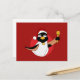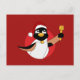 Postal con un ilustracion adorable y pequeño pingüino real sosteniendo un cetro y usando un sombrero rojo de Papá Noel; diseño de personalizado de vacaciones para Navidades para niños, en un fondo rojo
